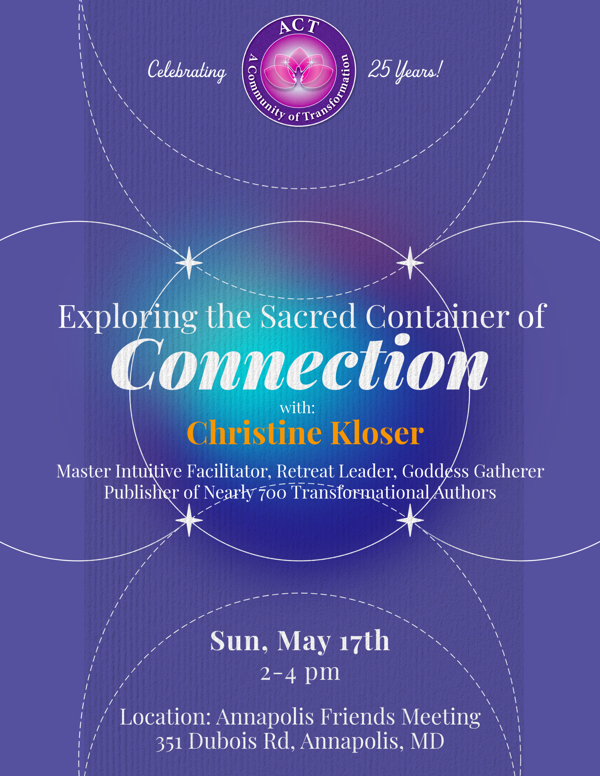 Christine Kloser has been a community leader and transformational intuitive facilitator of retreats, circles, live events, ceremonies and virtual programs since 1997. This is the work she was born to do, whether for small groups of “sisters” in her living room, 150+ people in a ballroom, at exotic destinations in Costa Rica, Bahamas and Tulum, Mexico, and for the nearly 700 transformational authors she has published as the founder of Seshat Press. Having worked with clients in 127 countries, she is honored and excited to bring this work to ACT Annapolis.